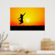 A girl jumping up in the air on top of a hill in front of a blood red sunset