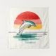 This minimalist piece features a stylised dolphin silhouette leaping against an abstract backdrop that evokes a serene sunset over the ocean. The artwork uses bold lines and a warm palette of red, orange, and yellow, contrasted with the cool tones of blue and green to depict the sea. This modern, simple elegance captures the essence of nature’s beauty through a contemporary lens. It's a serene yet vibrant depiction that would complement any modern decor, particularly for those who are drawn to nautical themes and appreciate the grace of marine life juxtaposed with the tranquillity of sunset colours.