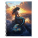 A beautiful mermaid sits on a rocky shore, her shimmering tail glowing in the golden sunset.