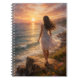 The artwork showcases a peaceful coastal scene where a girl stands by the shore, surrounded by warm golden sunlight, gentle ocean waves, and soft floral details. Created in a realistic oil painting style, the rich textures and natural lighting give this notebook a premium and artistic look that stands out.