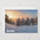 View of frozen snowy forest with covered in snow spruce, fir and pine trees on sea coast...