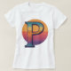 This captivating t-shirt design showcases the letter "P" set against a vibrant, sunset-inspired circular backdrop. The letter "P" features a stunning gradient that transitions seamlessly from deep blues and purples at the bottom to bright oranges and pinks at the top, echoing the colours of a beautiful sunset. The background circle enhances the letter with horizontal lines that mirror the gradient, creating a cohesive and harmonious visual effect. This design blends modern typography with natural colour transitions, making it a perfect choice for anyone looking to add a touch of artistry and elegance to their wardrobe.