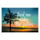 Find me under the palms! A beautiful sunset on a Hawaiian beach in the focus of this design. The sentiment brings the message of relaxation and the spirit of aloha to your home decor. The design is shades of blue blending into the gold, orange and corals of the sunset over the beach.