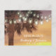 This beautiful beach wedding Save the Date postcard features a large palm tree and a brightly coloured sunset with edison style string lights glowing brightly. Perfect for a tropical or beach themed wedding.