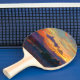 An art design of a beautiful sunset also showing rocks, beach and a man fishing.
