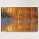 Gold and orange rays of a setting sun cast a slanted pattern among white birch tree trunks. The upright trees and orangy golden rays are reflected in a pond with the setting sun casting a remarkable triangular pattern. Are you up to the challenge of this unique jigsaw?