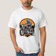 Stylized illustration of a motorcyclist wearing a helmet riding a custom motorcycle, rendered in black and white on an orange background with a setting sun and silhouetted trees, enclosed in a circular emblem with the word “BIKER”.