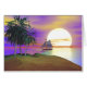 Greeting card with my artwork of a tropical sailing scene with a sailboat sailing past an island and palm trees with a setting sun in a sky of purple and yellow clouds.