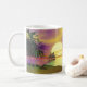 Coffee cup with my artwork of a sunny and relaxing tropical scene of an island, palm trees and sailboat sailing past a big sunset.
