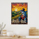 An imaginative artwork depicting a blue shark, wearing a top hat and stylish sunglasses, delivering a "sunset serenade" on an electric guitar from a rocky vantage point. The scene unfolds over verdant hills and trees, all bathed in the warm glow of a setting sun. The thick, expressive brushwork adds a tactile and dynamic feel to the entire composition, emphasizing the "ROCK and ROLL" energy.