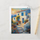 This image depicts a vibrant, impressionistic painting of a Mediterranean-style house bathed in warm sunlight. The house features whitewashed walls and blue shutters, typical of coastal architecture. A set of stone steps leads up to the entrance, flanked by lush, colourful flowers in terracotta pots. The background reveals a serene view of the sea, with the sun setting on the horizon, casting a golden glow over the scene. The painting uses bold, expressive brushstrokes and a rich palette of warm and cool colours, creating a lively and inviting atmosphere.