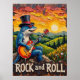 This vibrant, textured artwork captures a cool blue shark, wearing a top hat and red sunglasses, passionately playing an electric guitar. The shark is perched on a rocky outcrop overlooking rolling green hills dotted with trees and wildflowers, all under a fiery sunset sky. The bold impasto technique brings a three-dimensional quality to the scene, amplifying the energy of the "ROCK and ROLL" spirit.