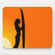 A cool design of a silhouette of a surfer girl holding her surfboard against a bright orange sunset. This beach, Summer inspired design is bright and vibrant and for lovers of surfing and the beach lifestyle all over the world.