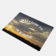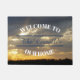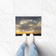Invite guests into your home with this one-of-kind doormat with my original photograph, "Sunset Through The Clouds". The photo features a silhouette of tree tops, in the distance. On the top of the there are soft, grey clouds, with openings that let the setting sun peak through. Beneath the grey clouds there is a golden yellow sky. The bold, white arched text reads "WELCOME TO OUR HOME". The scripted text, in the centre can be personal with your name. (Example: The Smiths; Mr. & Mrs. Smith; John & Mary Smith)