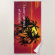 Beautiful tropical sunset Beach towel with image of a sun setting with the palm trees in silhouette in the background and message that says I never get tired of the beach. Designed as a beach towel, pool towel, or tell you can travel with.