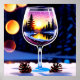 A stylized wine glass frames a sunset over a snowy landscape with evergreen trees, creating a warm, magical scene. Pinecones sit in the snow, while soft bokeh lights add festive mood.