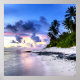 Experience the serene beauty of a tropical paradise with our stunning sunset beach photograph. This captivating scene features palm trees swaying in the gentle breeze, rugged rocks dotting the shoreline, and lush green bushes framing the golden sands.