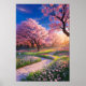 As the sun descends on the horizon, a magical scene unfolds in a sakura park. The sky is ablaze with hues of orange, pink, and gold, casting a warm glow over the landscape. Majestic sakura trees stand tall, their delicate blossoms shimmering in the fading light. The park is a tapestry of vibrant green grass and a myriad of colourful flowers, creating a breathtaking display of nature's splendour.