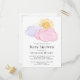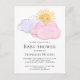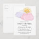 This cute girl's baby shower invitation postcard is decorated with pink and mauve watercolor clouds and a smiling yellow sun.