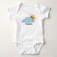 Cute baby bodysuit happy yellow sunshine peeking out from a big blue cloud with a template below to add your name, quote, text or delete to leave blank.