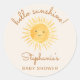 This cute baby shower sticker is decorated with a watercolor sun and says "Hello Sunshine!" in stylish script typography on a soft cream background. Perfect for a gender-neutral baby shower. Easily customisable. Original Watercolor © Michele Davies.
