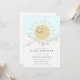 Neutral baby shower theme featuring illustration of a sunshine with smiling face over a blue sky with clouds at bottom and grey text.
