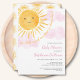 This cute sunshine girl's baby shower invitation features the text "Our little ray of sunshine is almost here!" with a watercolor smiling yellow sun and pink clouds.