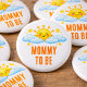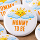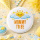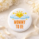 A cute sunshine-themed illustration featuring a smiling yellow sun rising above soft blue clouds and tiny golden stars. The bright, playful colour palette and friendly cartoon style capture the joyful spirit of a sunshine baby celebration. Bold lettering highlights the special role of the mum-to-be, creating a fun and memorable badge design perfect for photos, party outfits, and cheerful celebration moments.