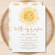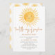 Are you planning a sun-themed twin's baby shower? This boho sunshine baby shower invitation features the text "Two little rays of sunshine are almost here!" with a cute watercolor smiling yellow sun. The back is decorated with a sun pattern. Perfect for twin boys, girls, or one of each baby shower. Easily customisable. Original Watercolor © Michele Davies.