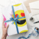 The fashionista will love this wrapping paper adorned with big rainbow bows, big pink bows, and trendy heart eyed smiling faces!