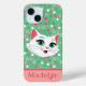Check out this totally adorable personalised phone case! It features the cutest green-eyed kitty cat ever, looking so sweet. The background is a super cool mint green colour, and it's covered in fun and colourful pink, green, and white circles and dots – it's so bright and happy!