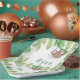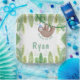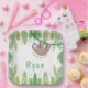Fun light and dark green jungle leaves decorate these jungle theme | sloth birthday paper plates. Super cute sloth hanging from a bright green vine in the jungle. Fun loving sloth is sporting a blue and white polka dot party hat! Perfect paper plates for animal, zoo, sloth, or other safari / jungle theme birthday.