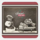 A Vintage Christmas Photograph with a super cute cat dressed in a holiday dress with hand warmer. The cat is pulling a sled of wrapped gifts. Message: Season's Greetings.