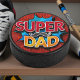 Super Dad Moustache Modern Grunge Hockey Pucks Hockey Gear features the text "Super Dad" in modern red and yellow typography on a blue and red grunge background accented with a moustache. Gifts for Dad for birthday, Father's Day, Christmas, holidays and more. Created by Evco Studio www.zazzle.com/store/evcostudio
