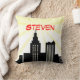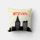 A comic book themed throw pillow with a yellow dotted star burst background and a black city scape silhouette. Add your own personalised text to make it your own! These decorative pillows are great in a super hero bedroom or nursery, or a grown up game room.
