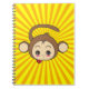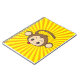 An illustration of a monkey face with blushing cheeks and his tongue sticking out. Looking cute and kawaii. The background is a cheerful yellow and orange pattern with sunrays bursting out around the monkey making him look super powerful.
