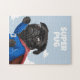 This cute design features a pug called super pug wearing a superhero suit flying through the sky.