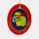 Celebrate the holidays with Hugo from Rhymington in this cheerful Super Simple Songs ornament! This festive design features Hugo the green monster bundled up in a red scarf and winter hat, holding a wrapped present with a big smile. Set against a navy blue background and framed in a bold red border, this ornament is full of colourful holiday cheer. The text is fully customisable—perfect for adding a name, year, or special message. A charming keepsake for little fans of Hugo and the Rhymington crew, this ornament brings playful personality to your holiday tree.