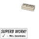 This motivating rubber stamp design features the motivating message "SUPERB WORK!" and a customized teacher's name. It also features a decorative check mark. It could be used by a teacher or educator when marking assignments, to acknowledge that the student has done well.