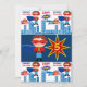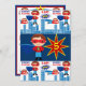 Calling all Superheroes Kids Birthday Party Invitation template for a boys birthday party with a red, blue, and yellow comic book superhero colours. These cute Super Hero Invitations have a superhero boy standing with his hands on his hips with a blue cape flying in the wind, a red eye mask, and a hero costume with a "S" on his chest for Superhero. Next to him is a red and yellow star burst design with your child's age. The top and bottom of the invitation has a collage of flying superheroes and a buildings sketched in blue. Also are the words Zap Pow Zing and Ka-Pow. The backside of the invitation has another super hero design and all the party details. These are cute and brightly coloured invitations for boys who love Super Heroes or Comic Book characters.