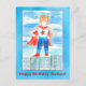 A fun postcard to wish a young boy a happy birthday decorated with a superhero dressed in a red, white and blue costume with mask standing tall! Illustrated with watercolor.