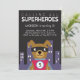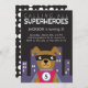 Cute birthday party invitation template for a boy's superhero theme party. Illustration of a dog in superhero outfit standing in front of a city skyline. The wording on top says "Calling All Superheroes." The party information follows. Customise this product by adding the birthday boy's age on the dog's superhero shirt. The texts are easily editable online.