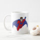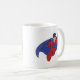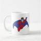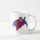 Illustration of a super hero man dressed in red and blue costume with cape flying through the air