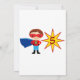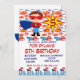 Calling all Superheroes Kids Birthday Party Invitation template for a boys birthday party. These cute Super Hero Invitations have a superhero boy with a blue cape and red eye mask with a "S" on his chest for Superhero. It has fun background that has superhero words like "Pow" "Zing" "Zap" in red, yellow, and blue. It also has your child's age in a star burst design. The invitation text area is bordered by flying superheroes on the top and super heroes standing on top of building along the city's skyline of buildings on the bottom. The backside of the invitation also has a full colour superhero and another star burst in yellow and red, with the age of your child. The background of this invitation is white. These are cute and colourful invitations for boys. Just enter your child's birthday party information in the template spots. Use the customise it button if you want to move things around or change the colours of the font. It is shown in red and blue in a comic book style font. These are perfect invitations for a super hero party for boys.