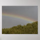 A rare, supernumerary rainbow, echoing itself with additional bands of colour, above an evergreen forest.