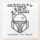 This image features a stylised depiction of a round helmet. The helmet is outlined in black, with a dotted pattern filling in the interior. Above the helmet, a series of geometric shapes are arranged in three rows, reminiscent of a coded message, with the words "SUPPORT THE TROOP" written below the helmet. The design suggests a connection to the space and universe and a message of support for military personnel. The graphic is clean and minimalist, with a bold, impactful style.