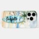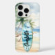 A watercolored sandy beach, ocean waves and palm trees as background, and a blue surfboard on the beach. Personalise and add a name.