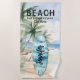 A watercolored sandy beach, ocean waves and palm trees as background, and a blue surfboard on the beach. Personalise and add a name. Quote: Beach. Best Escape Anyone Can Have