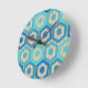 This clock has a geometric design of hexagons in four shades of blue on a field of tan stripes in two shades.