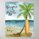 Baby on Board! Baby shower invitation - perfect for a summer baby shower. Beach theme. Watercolor design has a ocean and beach scene with surfboard, palm tree and summer hat.